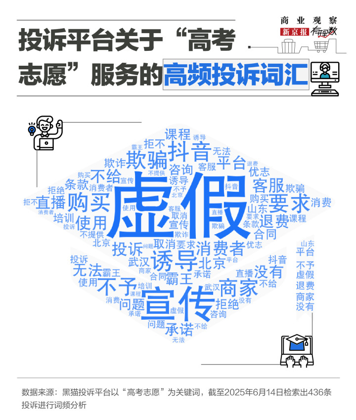 在黑猫投诉平台上,“虚假宣传”为目前高报行业里最突出的问题,此外,“诱导消费”、“不予退款”、“霸王条款”等等也是消费者在高报机构“踩过的坑”。