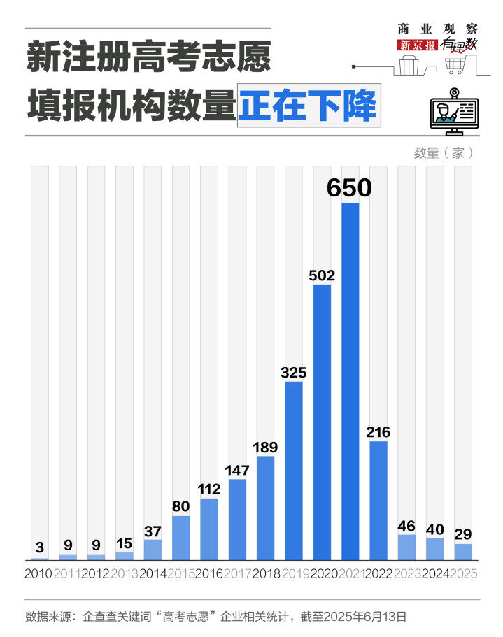 AI工具对行业的冲击来势汹汹,目前,以优志愿、蜻蜓生涯为代表的部分机构在其产品服务中增加了AI作为辅助,整体行业生态向金字塔结构转型。这一转型并非没有代价。数据显示,2010年到2025年,高考志愿填报机构的新注册量呈现峰值后断崖式下跌,每年新创立机构数量连续四年呈现下降趋势。